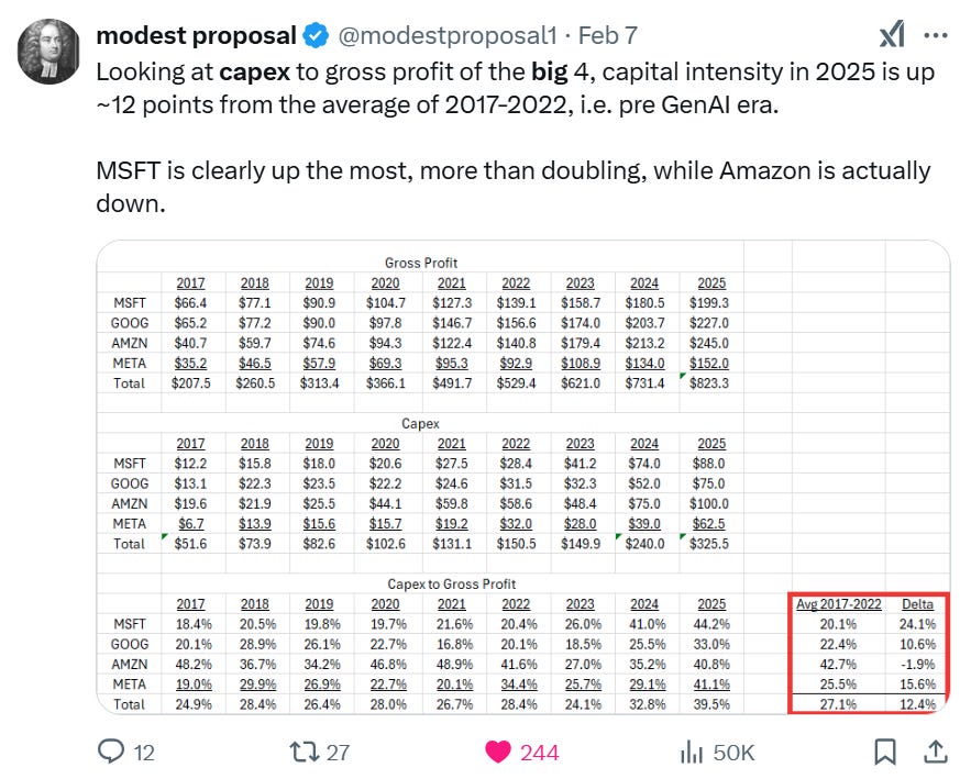 However, it may not just be about AI challenges—it’s also about capital intensity. Historically, the MAG 7 thrived on their asset-light business models, allowing them to outperform most companies and grow into industry giants. But now, they are being forced to invest heavily in infrastructure.
