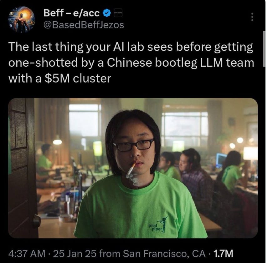 What’s most impressive is that this breakthrough isn’t coming from a major tech giant but rather from an unknown hedge fund side project in China. (The above meme is funny!) This underscores the shifting dynamics in AI development, where innovation is no longer confined to the traditional powerhouses.