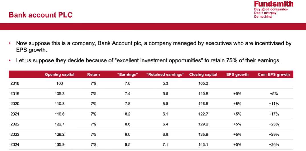 They also explained why they dislike earning per share growth because all management has to do is to retain a certain % of earnings and reinvest at similar return to get the EPS growth as shown from the above. There is no increase in return which we, as an investor should care about.