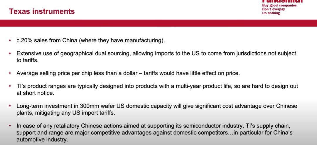 One example they shared was Texas Instruments. A simple slide illustrated how the company is well-positioned to withstand challenges—primarily due to its status as the lowest-cost producer, the high switching costs for customers, and the relatively small expense its products represent in their customers' overall budgets.