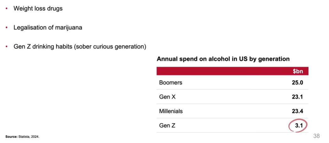 Regarding their decision to sell Diageo, they believe the alcohol industry is encountering challenges, as mentioned in the above slide. Before anyone objects to their final point, noting that the youngest Gen Z cohort (born after 1997) is still just 13 and far from legal drinking age, they argue that the likelihood of this group adopting the same consumption patterns as prior generations is slim. Given such uncertainty, they prefer to step back from the game and watch from the sidelines.