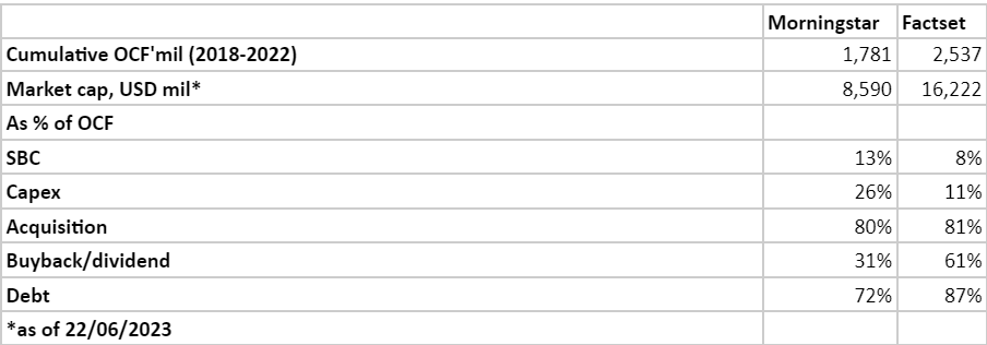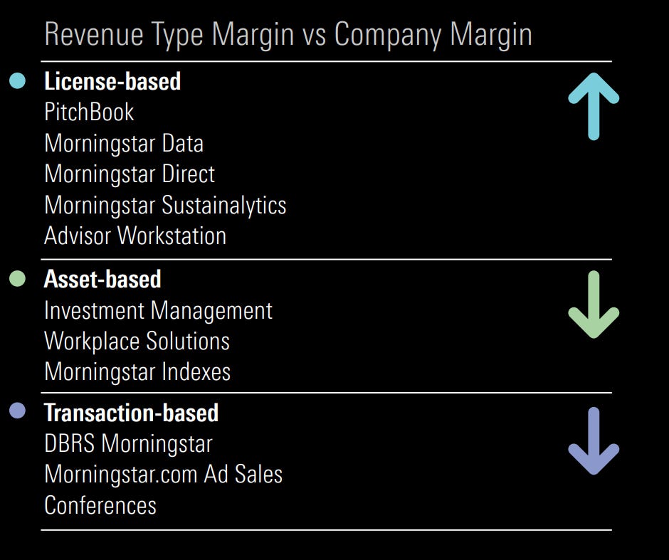 Joe has made a pretty compelling case with their Morningstar branded license business (Ie: Data, Direct, Workstation). First of all, it has high customer-switching costs. Morningstar is a classic razor and blades business. Once they install their software, their customer will need their data and research. These data and research “blades'' are time-sensitive and require updating to be valuable.
