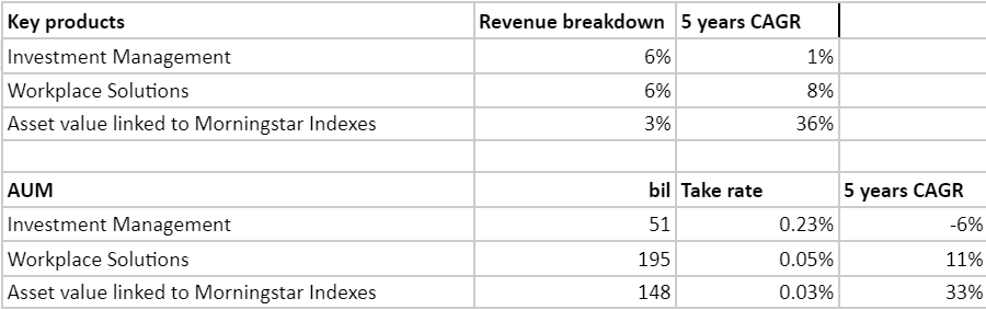 With the rise of 401k in the US (retirement saving plans), Morningstar Workplace solution is one of the leaders due to their unique capability of democratising fund investing (think of their fund ratings). Employees could easily purchase funds that fit their criteria for retirement based on a simplified investing process. For example, Morningstar just completed the enrollment of 11,000 Raytheon Technologies participants, representing about $3.2 billion in assets under management.