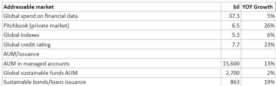 Another area of growth will be on ESG with their acquisitions on Sustainalytic. Morningstar is ramping up its investment in ESG by increasing alot of headcounts in this segment to build up their database. (ie: investing $30-40mil annually) It is likely to be losing money at its current revenue- $100mil. (based on my estimation of 100k annual salary for its analysts for around 885 of them, salary alone will cost around $90mil.)