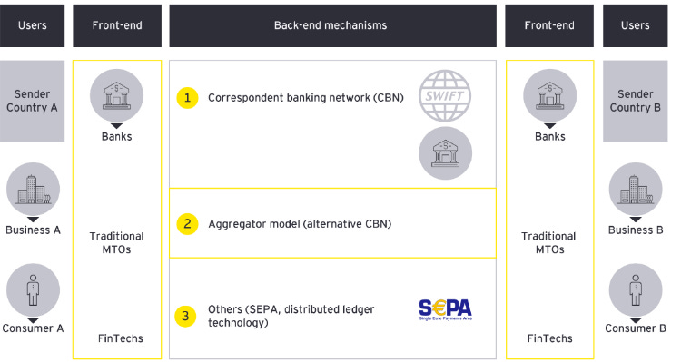 Traditionally, users typically choose a front end provider such as banks or traditional Money Transfer Operators (MTOs) (Eg: Western union) for transfer or payment. These payments flow via the correspondent banking network (CBN) to settle payments.
