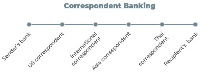 The problem with corresponding banking networks is that money has to flow through multiple layers before reaching its end customers. Besides, there is little competition and it is dominated by a few dominant global correspondents.