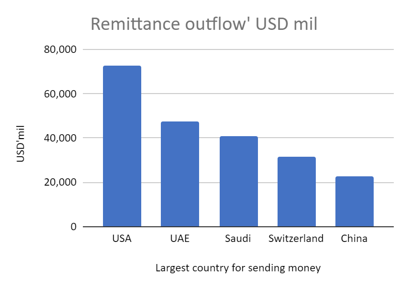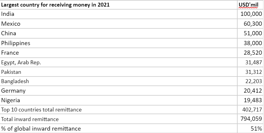 From the table above, developing countries remain the largest inflow on remittance. Top 10 countries made up 51% of the total volume. Majority of these countries share the common characteristics like poor banking system, high unbanked/underbanked population,etc.