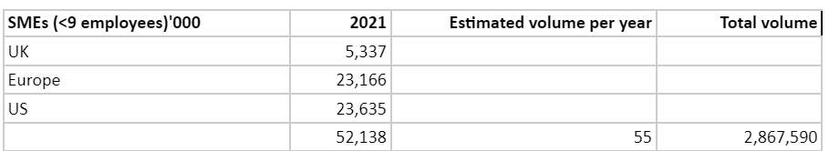 It is much harder to estimate as Wise has minimal disclosure on business use cases. To simplify the thinking, let's just take Uk, Europe and US SMEs businesses that employ less than 10 staff as these are the markets that are usually underserved by banks.