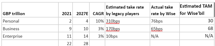 Assuming unchange take rate and 3% growth as suggested by EDC for the next 5 years, their TAM will be around $21 bil or £17 bil. It is a huge TAM and Wise will be gearing up to compete in this segment.