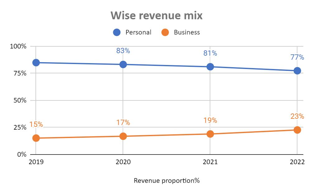 Majority of the revenue is derived from this segment. It charges an average take rate of 0.76% for its personal customers. This is the segment that Wise has an edge over their incumbents as these markets are traditionally being underserved and charged the most by the incumbents.